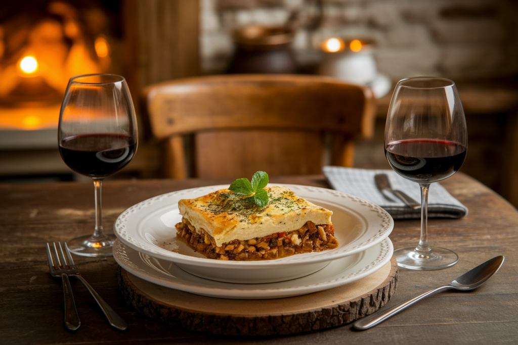 Côté grec, essaie un Agiorgitiko ou un Xinomavro léger. Ces cépages locaux offrent un bel équilibre entre fruit, épices et structure qui complète parfaitement les saveurs de la moussaka.